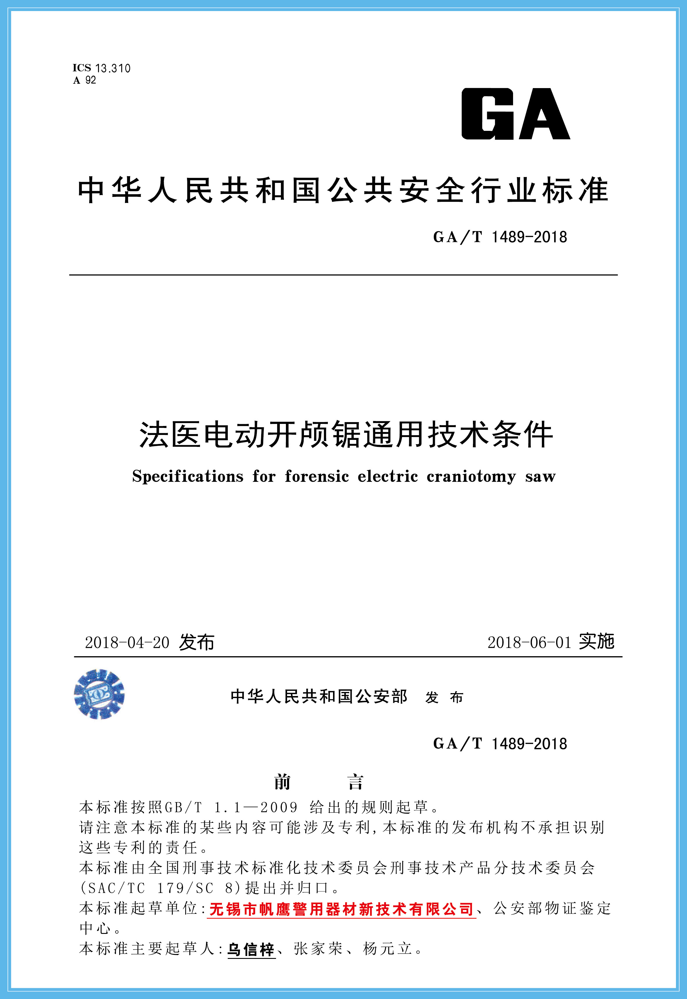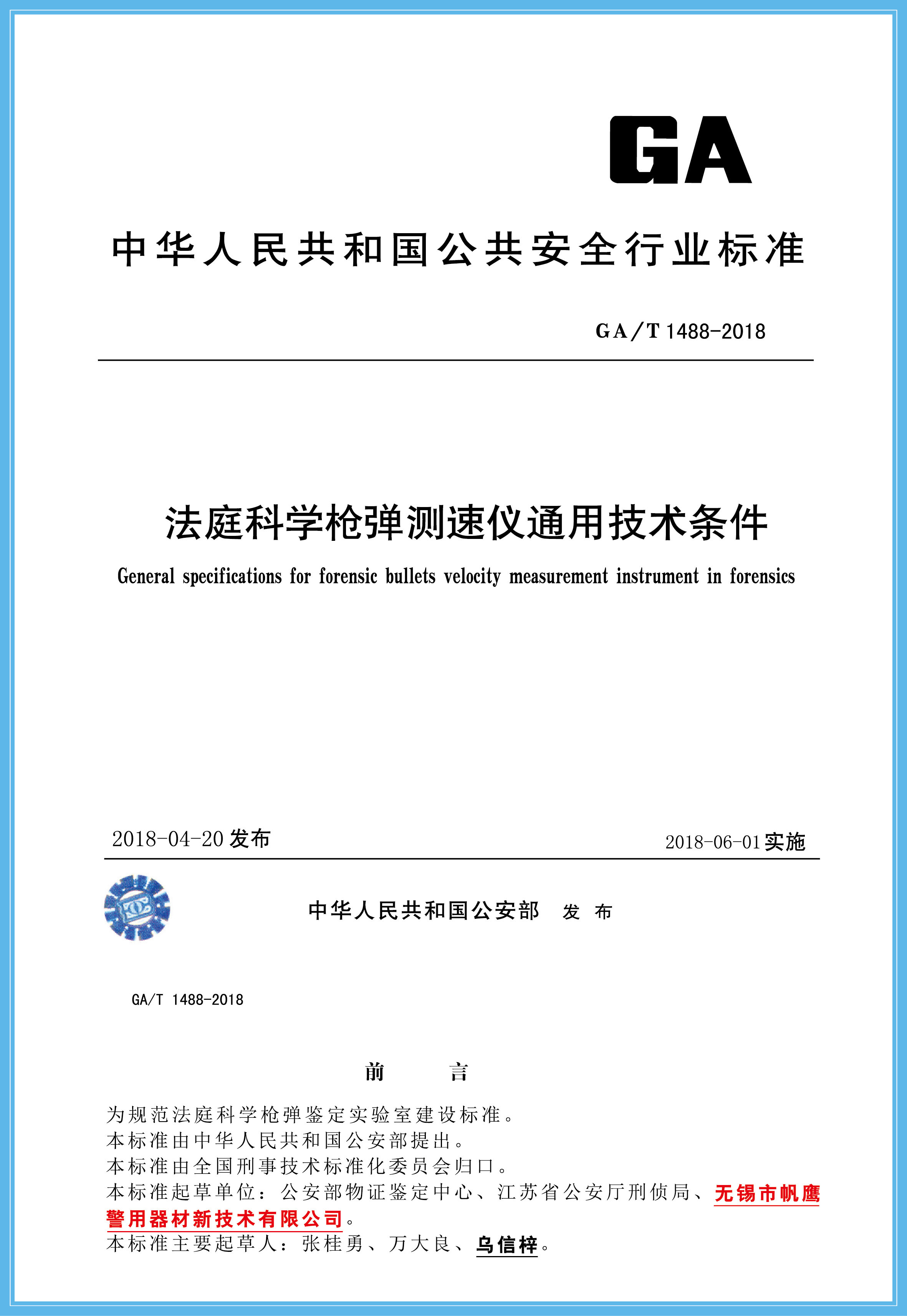 無錫市帆鷹警用器材新技術有限公司起草了11項行業標準,目前公安部已審核通過10項,此次通過的3項為2018年度公安部新列標準,已報國家質量監督檢驗檢疫總局備案,通過的3項標準為:法醫科學槍彈測速儀通用技術條件(GA/T 1488-2018)、法醫電動開顱鋸通用技術條件(GA/T 1489-2018)、法醫科學危險槍支射擊架通用技術條件,現特予以公告。
