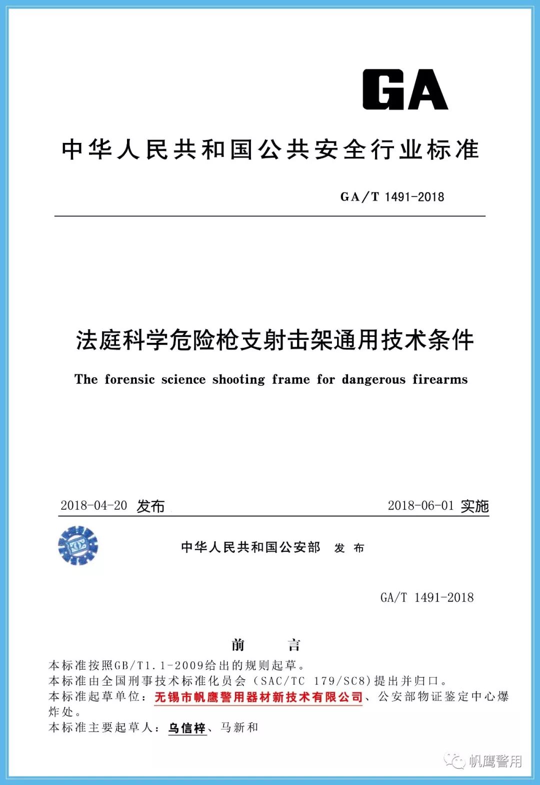 2018年,為了規范法庭科學槍彈鑒定實驗室建設標準,由公安部提出,并經全國刑事技術標準化委員會歸口,由無錫帆鷹警用器材新技術有限公司起草GA419-2018《“502”指印熏顯柜》、GA/T1488-2018《法庭科學槍彈測速儀通用技術條件》、GA/T1491-2018《法庭科學危險槍支射擊架通用技術條件》等三項中華人民共和國公共安全行業標準,分別在2018年5月份、6月份正式實施。