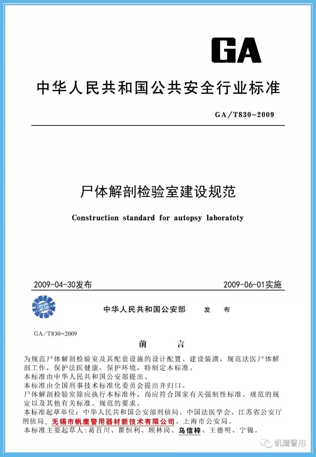 截止2019年,無錫帆鷹警用器材新技術有限公司先后共起草11項行業標準。標準含蓋解剖臺、熏顯柜、指紋捺印盒、槍彈射擊架、槍彈測速儀等硬件設備,也包含尸體解剖檢驗室、槍彈檢驗實驗室、法醫臨床鑒定室等工程建設。